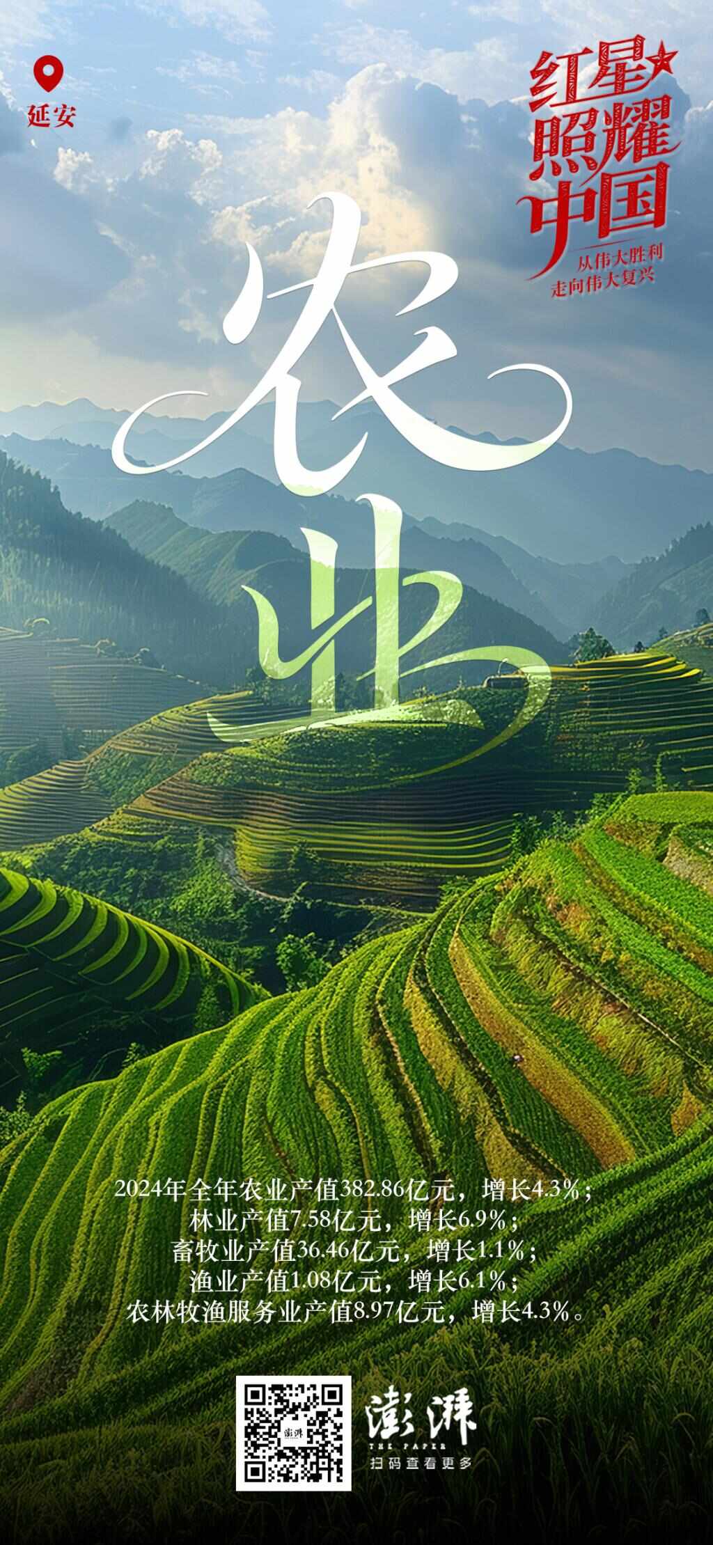延河昼夜不停地流淌,红土地多年来气候状况各异。在延安精神的照耀下,新城发展的丰硕历史被热情书写。延安大力发展县域经济、民营经济、开放型经济、数字经济,将迎来稳增长、惠民生、避风险的新局面。全市经济绩效持续向好,发展后劲不断增强,城乡发展一体化、相互促进,生态环境持续改善,社会大局保持平稳稳定,延安新时代中国式现代化“164”工作布局取得突破。 2024年,全年农业总产值382.86亿元,增长4.3%;全市工业总产值尝试在指定尺寸以上增加3.1%;全年服务业增加值增长3.9%;全年共接待国内游客4731.54万人次,增长12.7%;城镇居民人均可支配收入44867元,增长4.1%;全年完成造林面积87.95万公顷,森林覆盖率达到45.28%……从依托煤炭资源的“黑色经济”,到高端制造装备、新材料、大数据等新兴产业遍地开花。在延安精神的熏陶下,这片生机勃勃的土地正在呼应着高质量发展的新形象。海报设计 于飞 数据制作人:2024年延安市国民经济和社会发展统计公报