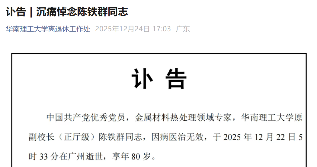 近日,华南理工大学发布讣告称,中国优秀共产党员、金属材料热处理领域专家、华南理工大学原副校长(正厅级)陈铁群同志因救治无效于2025年12月22日5时33分在广州逝世。他今年80岁了。据了解,陈铁群1946年10月28日出生于广东五华,1970年毕业于武汉工学院铸造专业,留校任教。 1975年加入中国共产党。1984年进入比利时鲁汶大学冶金系进修。 1985年转入材料科学与工程专业。 1989年获得博士学位后回国。获得毕业证书,1994年被聘为教授,1996年被聘为博士生导师。1990年至2000年,陈铁群历任微量分析中心主任、实验管理办公室主任、材料科学与工程系主任、院长助理、副院长、武汉大学汽车工业学院常务副院长。 2000年,陈铁群担任华南理工大学副校长(正厅级)、研究生院院长。 2008年退休。此外,陈铁群曾担任中国汽车工业协会常务理事、中国汽车工程学会材料专业委员会主任、湖北省汽车工业振兴领导小组成员、中国机械工业教育协会常务理事、高教委副主任委员。陈铁群一直从事金属表面强化、失效与无损领域的教学和研究工作。进行了很长一段时间的积极测试。主讲金属物理、金属力学性能、金属力学性能微观理论等课程。出版多部教材和专着,享受国务院政府特殊津贴。华南理工大学表示,陈铁群担任华南理工大学副校长(正厅级)期间,顾全大局,淡泊名利,开拓创新,勇于担当。深入参与人才培养、学科建设等多项重要活动。他帮助学校获批设立研究生院,在学科建设和领军创新人才培养方面不断取得长足进步,为华南理工大学的发展做出了重要贡献。陈铁群的去世是华南理工大学的巨大损失。 2018 年,一在华南理工大学相关吊唁活动中,陈铁群表示,他关注学校的进展,关注华南理工大学在国内外权威排名中的排名、学位分变化等数据。他还谈到了团队建设的话题,衷心祝愿华工的发展更上一层楼。今年6月,华南理工大学举行2025年“建党五十年”纪念章颁发仪式。陈铁群以太君身份出席活动。来源|华南理工大学退休工作办公室、中国基金报